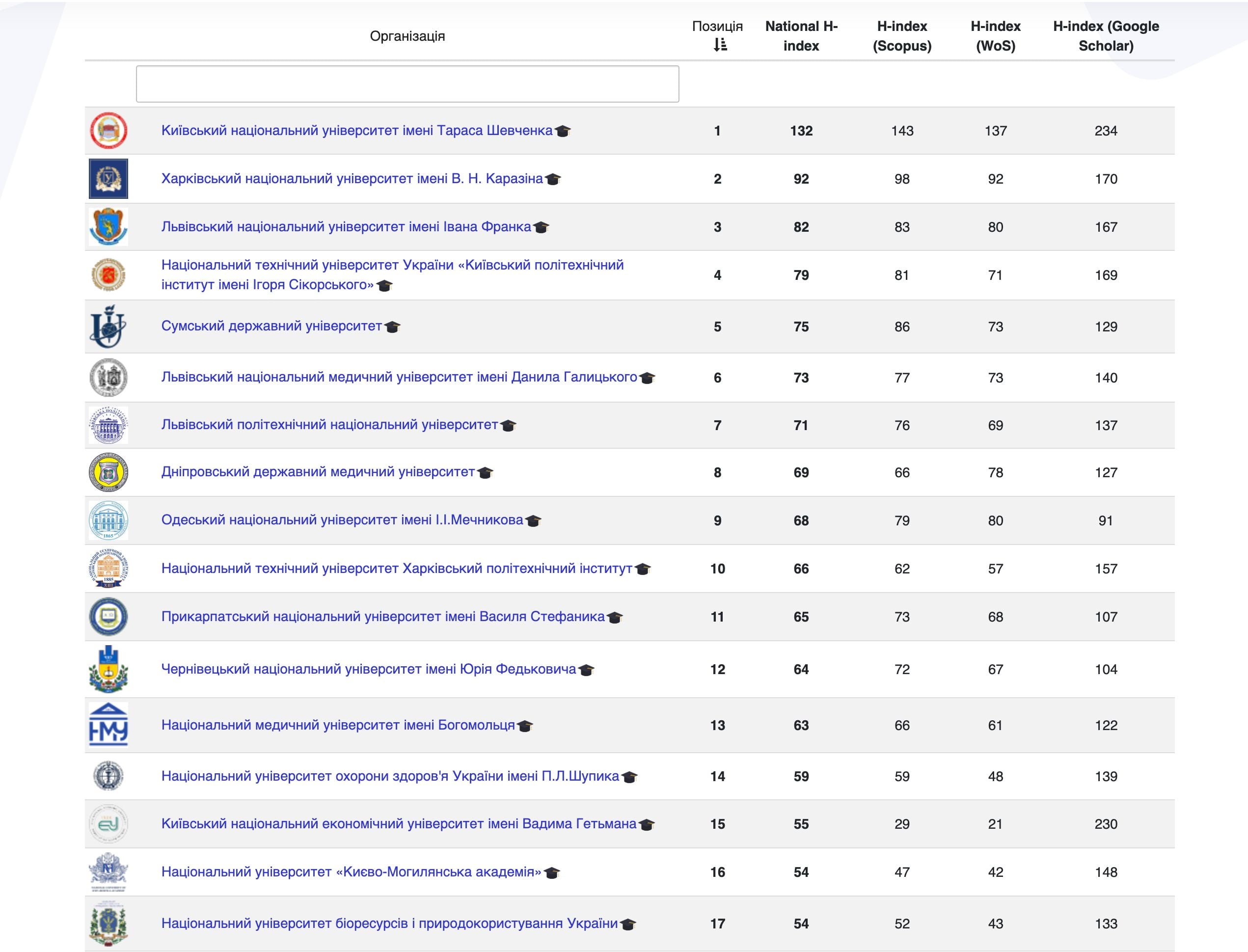 Ukrainian National H-index Ranking – це некомерційний проєкт, над яким працює міжнародна команда вчених із США, Великої Британії, України та інших країн. Ключовим показником є індекс Гірша (H-index), який відображає кількість наукових публікацій та їхнє цитування. Дані беруть із баз Scopus, Web of Science та Google Scholar. Національний фокус рейтингу оцінює університети саме в межах України. Це дозволяє більш об’єктивно порівнювати їхню наукову продуктивність і формувати внутрішню наукову політику.