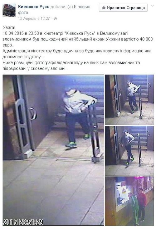 «В кінотеатрі «Київська Русь» у Великому залі зловмисником був пошкоджений найбільший екран Україні вартістю 40 000 євро», - йдеться у повідомленні.