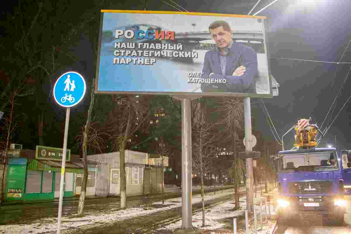 У ніч на четвер, 30 січня, у різних районах Києва почали з’являтися білборди з дуже неоднозначною рекламою. На них було написано «Росія – наш головний стратегічний партнер» російською мовою і розміщена фотографія Олега Катющенка, який, як з’ясувалося, є бізнесменом у сфері нерухомості.