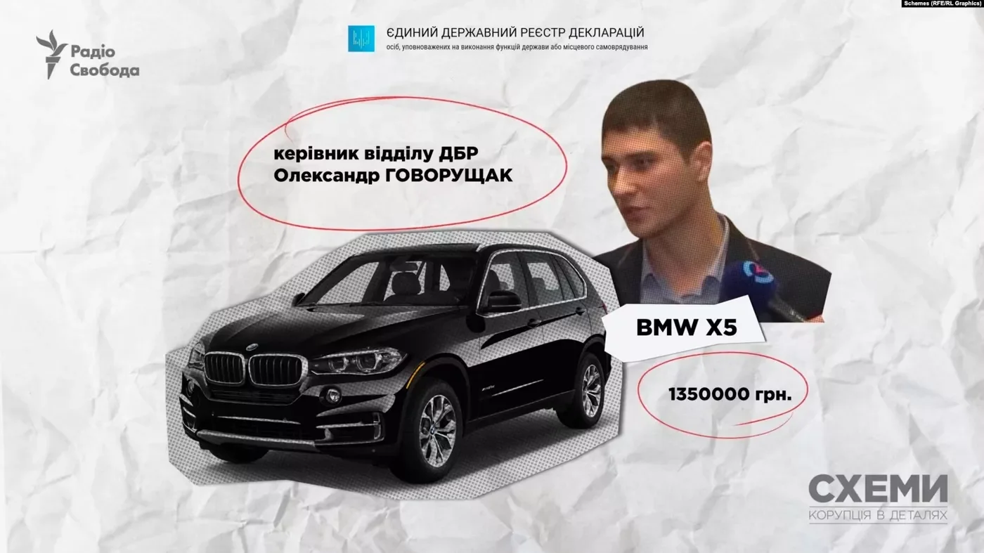 Власником нового автомобіля також став керівник відділу ДБР Олександр Говорущак. У своїй декларації він вказав, що у вересні 2022 року став власником BMW X5 2018 року випуску вартістю 1,35 млн грн. на питання журналістів щодо доцільності покупки Говорущак відповів ухильно, заявивши, що інформація про авто може не відповідати дійсності.