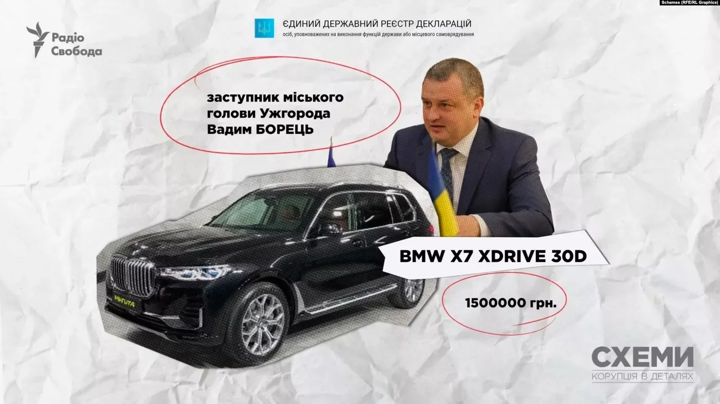 Нова машина з’явилася також і в заступника мера Ужгорода Вадима Борця. Згідно з його декларацією, наприкінці 2022 року він став власником BMW X7 XDrive 30D 2022 року випуску за 1,5 млн грн. Сам Борець на запитання про нове авто не відповів та запропонував журналістові «Схем» приїхати в Ужгород.