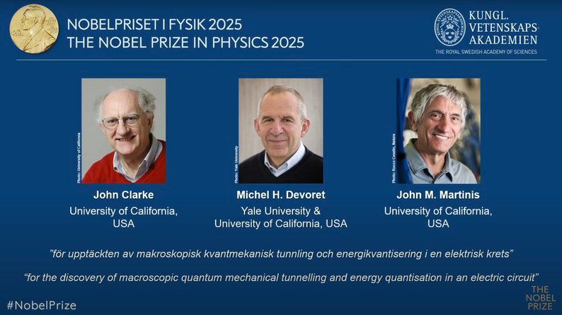 Нобелівську премію з фізики 2025 року отримали американці Джон Кларк, Мішель Деворе та Джон Мартініс. Про це у вівторок, 7 жовтня, повідомили на сайті Фонду Нобеля.