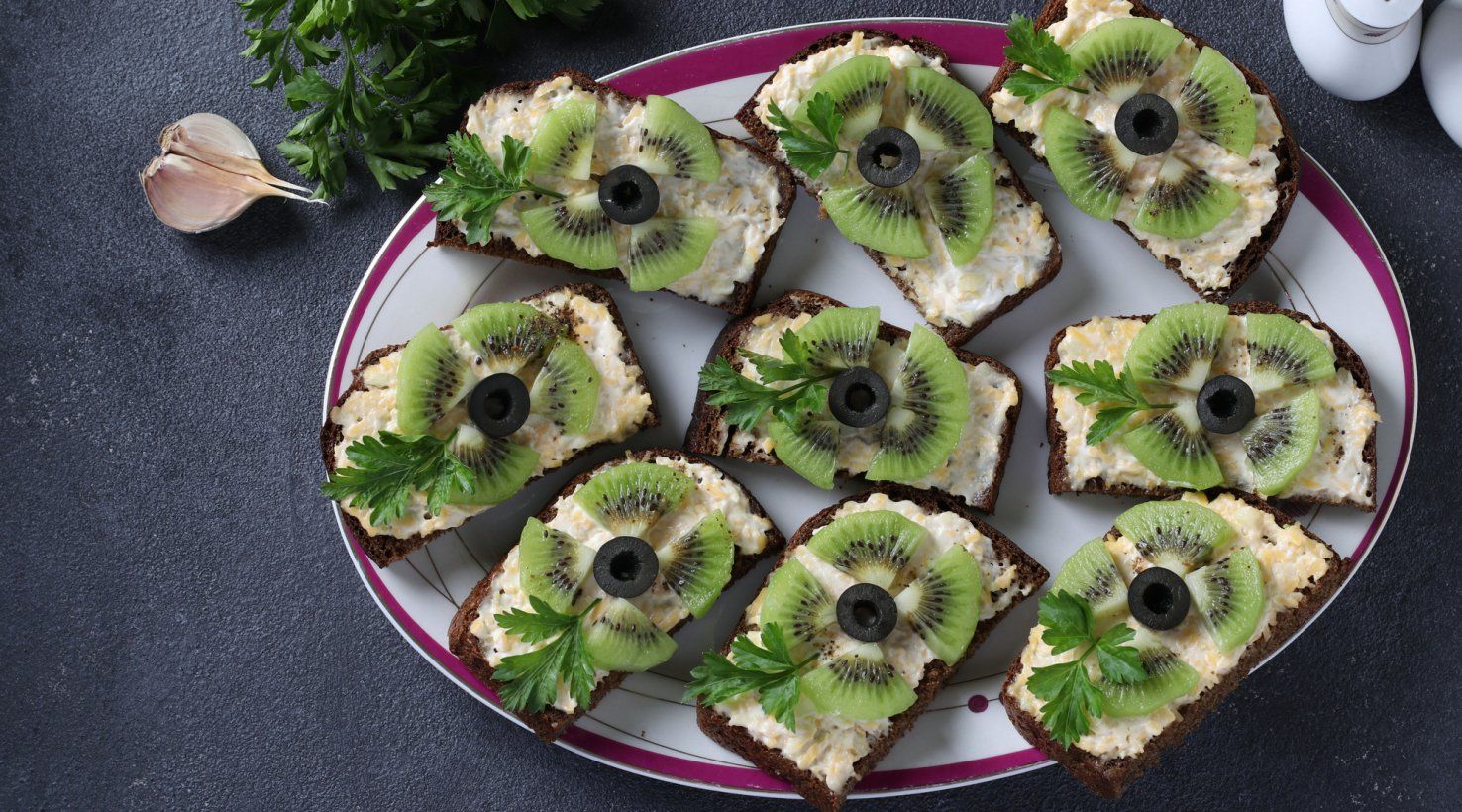 Закуска, яку можна приготувати всього за 15 хвилин. Солона сирна намазка в поєднанні зі свіжим кислуватим ківі створює яскравий смак, що чудово пасує до фуршетного чи святкового столу.