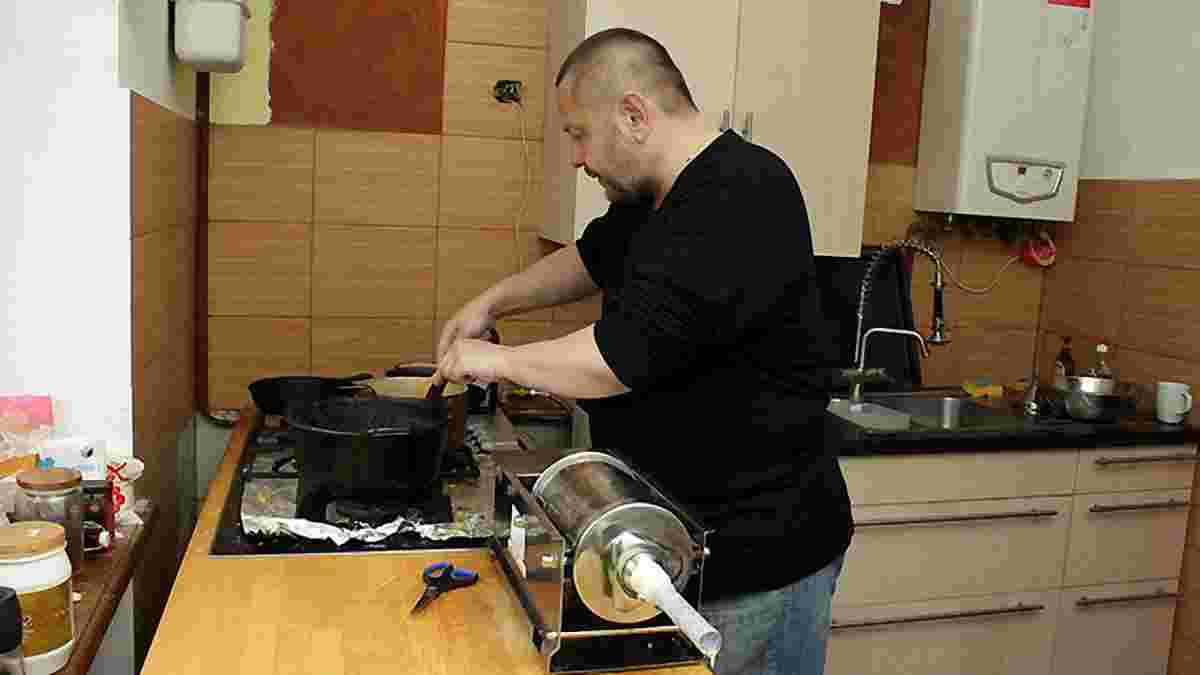 Андрій Азаров начиняє ковбаси. Фото: ZAXID.NET