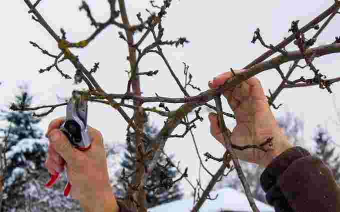 Взимку обрізаємо яблуні, груші, вишні, сливи і смородину, аґрус, барбарис. Враховуючи час пробудження, спочатку обрізаємо зерняткові, потім кісточкові культури. Обрізання можна проводити з кінця січня до початку березня. Важливо встигнути до початку руху соку. Температура повітря має бути не нижче за -5 °С. Про інші важливі правила зимової обрізки дерев пише Аgroapp.