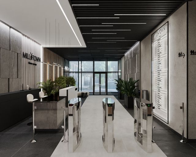 Що пропонує БЦ MillTown? На першому поверсі тут розташований просторий дизайнерський хол з рецепцією, системою контролю доступу до ліфтів та офісів, а також – комерційні приміщення, що зможуть задовольнити різноманітні потреби працівників.