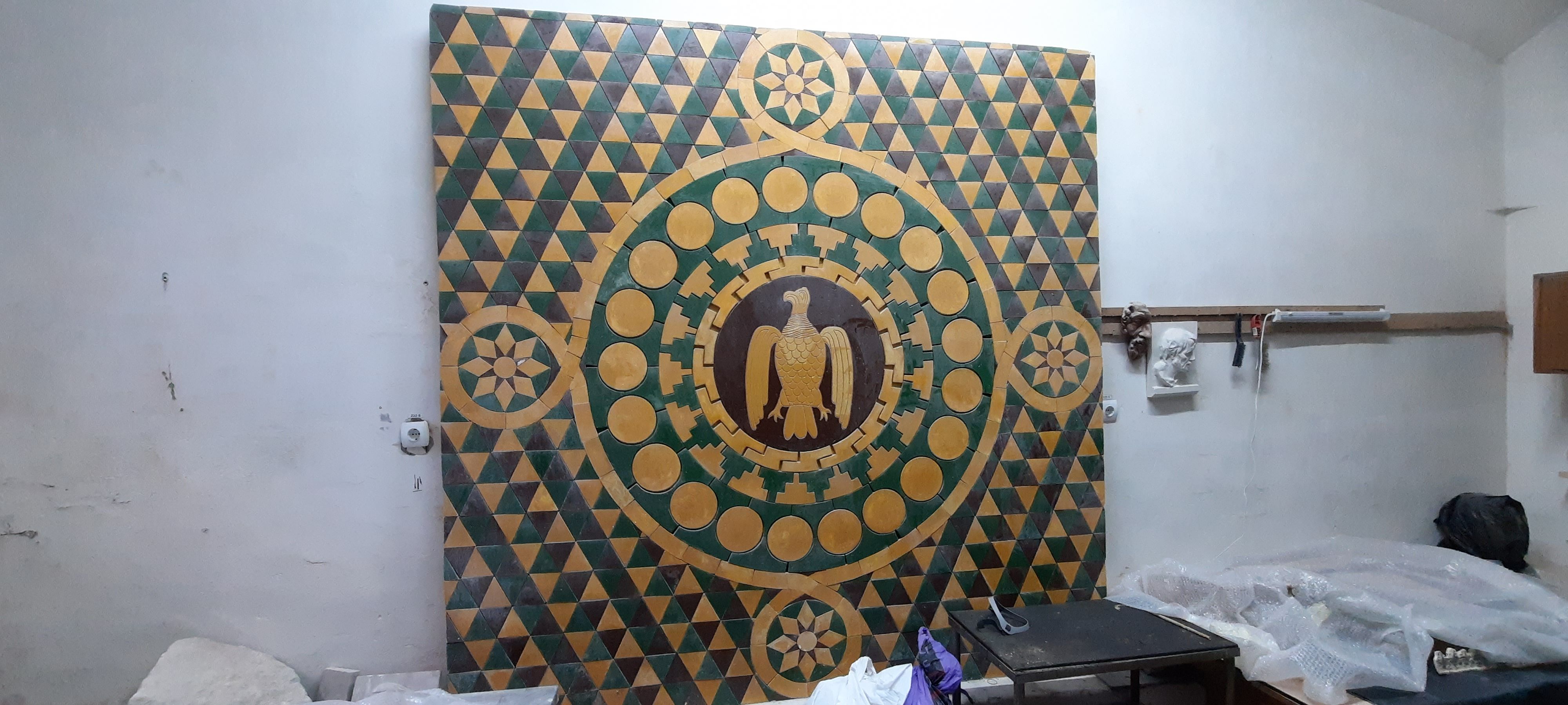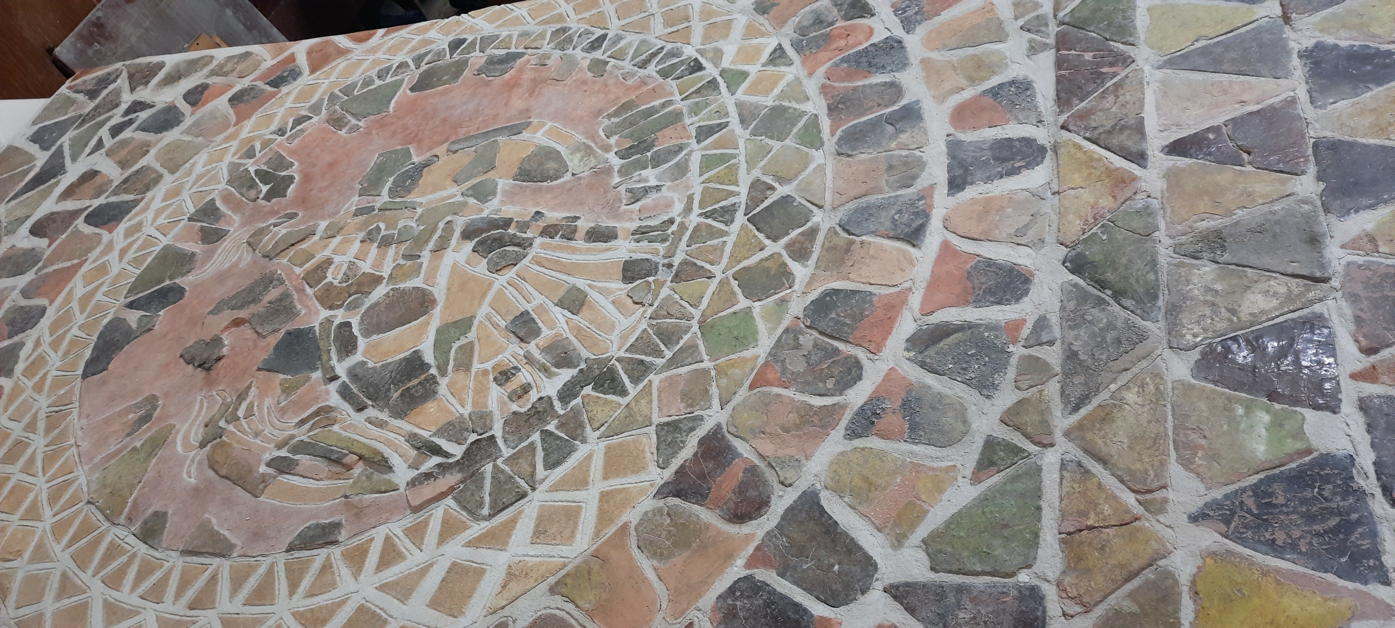 Мозаїку підлоги з птахом посередині відтворила реставраторка Тетяна Рупа. За деякий час її можна буде побачити у музеї археології ЛНУ.