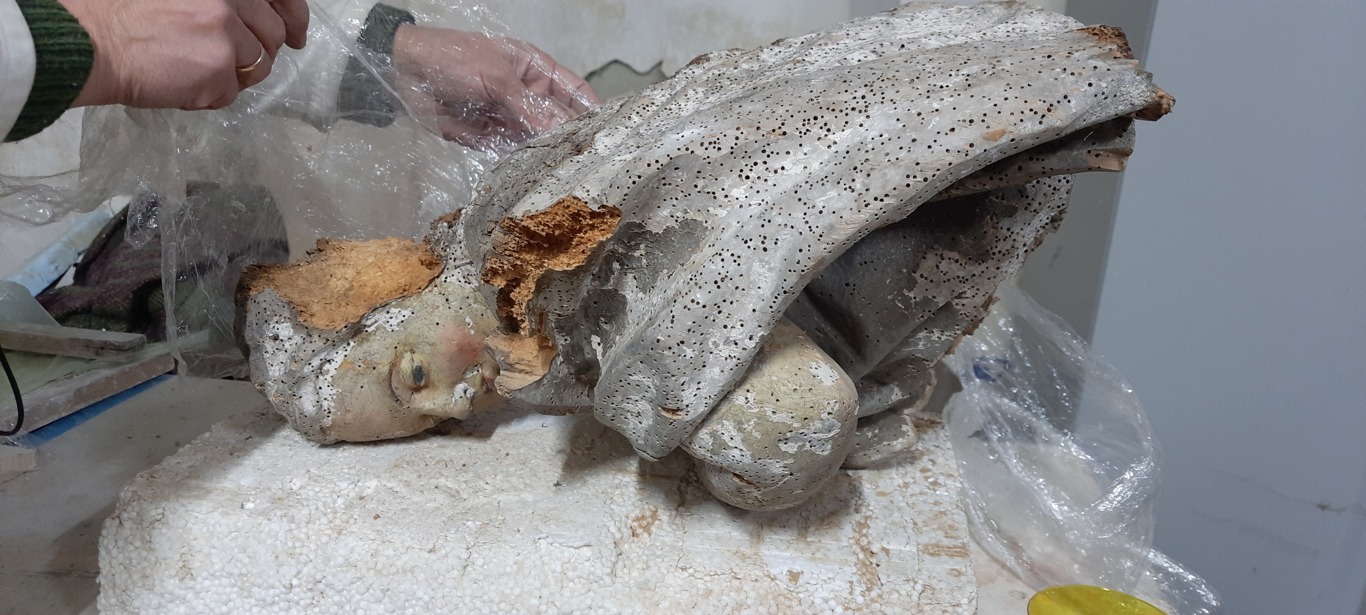 В університетській майстерні відновлюють чимало робіт з Бережан. Зокрема, тут рятують дві понищені скульптури авторства Йогана Пфістера з королівського червоного мармуру, які стояли в каплиці-усипальниці Сенявських у Бережанах.