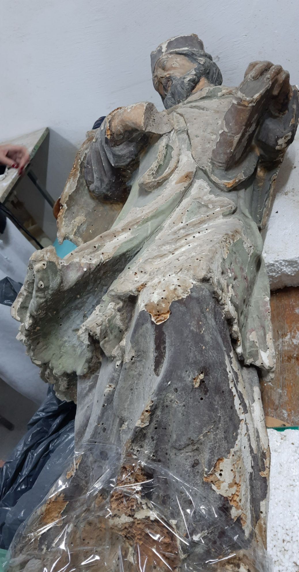 А ще дві деревʼяні скульптури знайшли у смітнику. Хтось навіть пробував «реставрувати» їх самостійно: вони мали прибиті цвяхи і намотану матерію. Ймовірно, скульптури походять з костелу монастиря кармелітів черевичкових. Він існував раніше поруч з корпусом політехніки, на його місці згодом влаштували вʼязницю, де сидів Іван Франко. Від того костелу донині збереглася лише одна північна стіна з фресками, все решта демонтовано під стоянку.