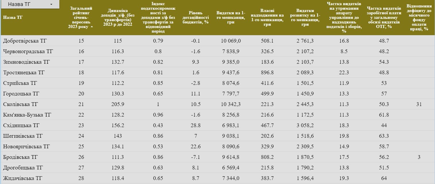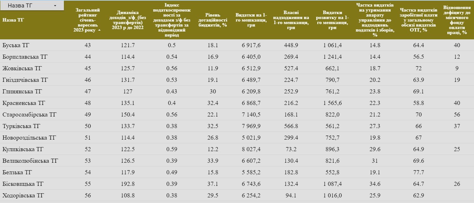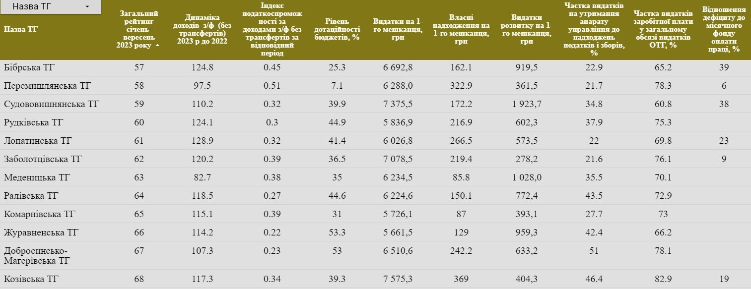 Останні місця в рейтингу 73 громад Львівщини посіли Боринська, Підкамінська, Стрілківська, Хирівська та Добромильська громади. Рівень дотаційності їхніх бюджетів становить понад 40-50%.