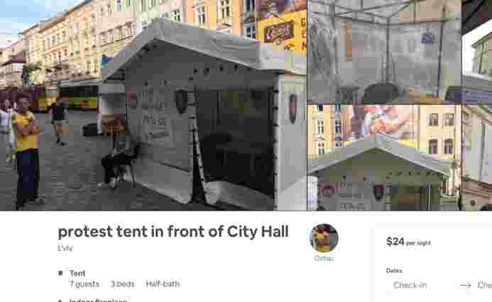 На міжнародному сервісі з пошуку короткострокової оренди житла Airbnb з'явилось оголошення про здачу палатки протестувальників під львівською Ратушею. В опублікованому 22 червня оголошенні вказано, що за ніч в палатці доведеться заплатити 24 долари.