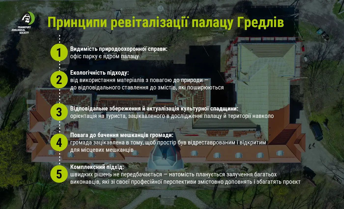 Команда фахівців обговорила потреби громади і нацпарку, а також можливості, які може створити велика площа у 2560 м2 будівлі палацу Гредлів. За попередніми висновками потенційні функції палацу можуть бути такими.