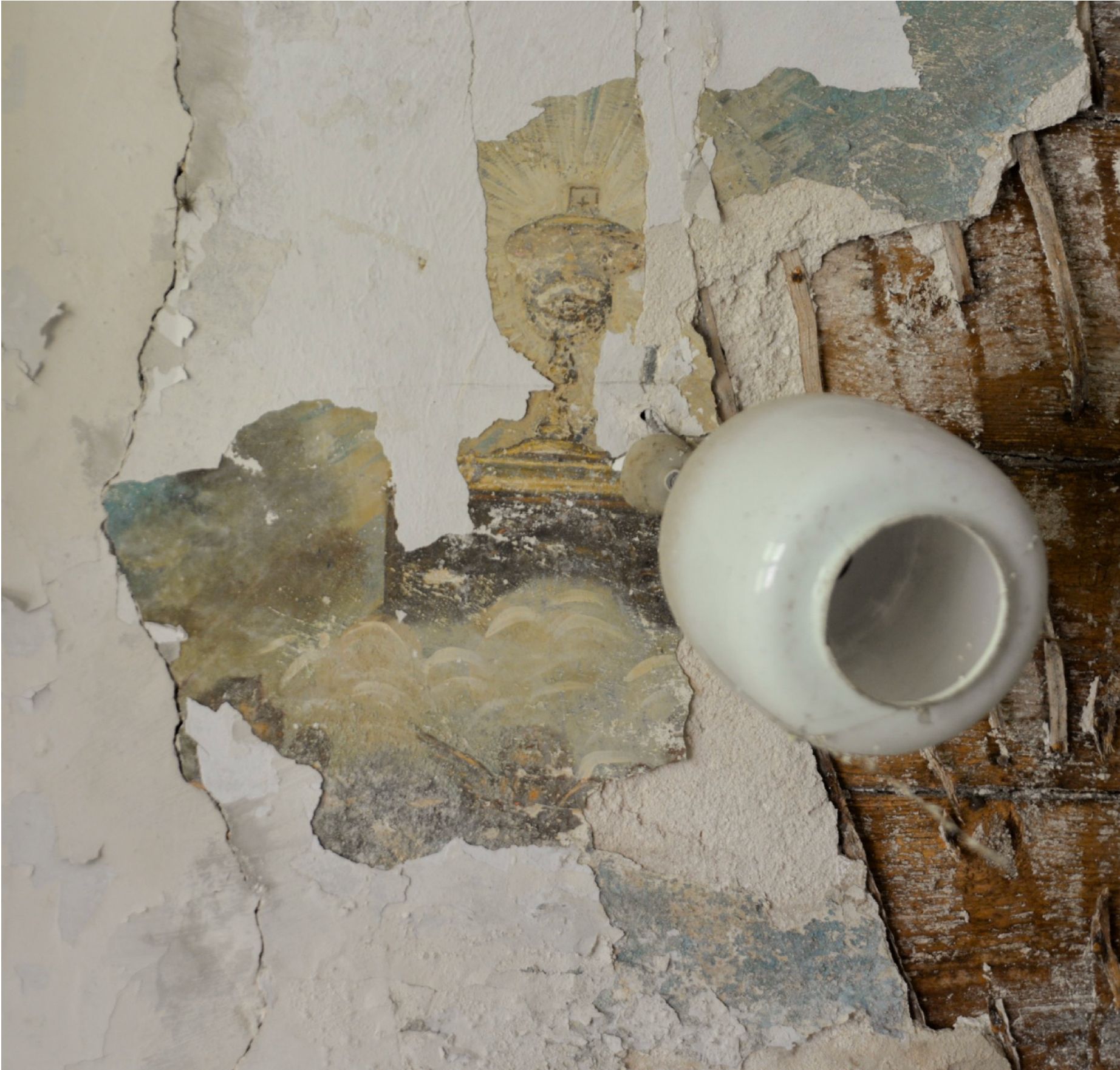 «Ми довший час не знали, чи були якісь розписи в тій будівлі. Через лущення штукатурки сам розкрився один фрагмент на стелі кімнати другого поверху. Очевидно, це була маленька капличка. Там видно чашу на престолі та двох херувимів внизу. Сусідній фрагмент цього розпису вже зруйнований, він пошкоджений грибком і вологою. У радянський час там зробили туалет. Навесні реставратори намагатимуться це законсервувати і робити подальші зондажі», – розповіла Анна Сербін.