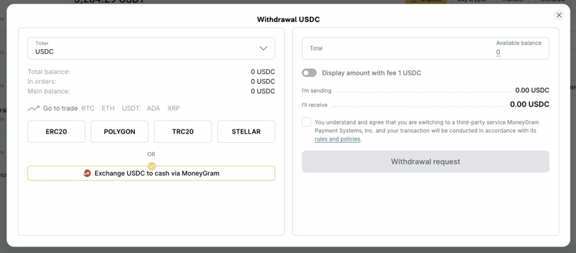 Для конвертації USDC авторизованому користувачу біржі потрібно перейти до основного балансу свого акаунту WhiteBIT, знайти USDC та натиснути «Вивести», а потім обрати MoneyGram як спосіб зняття. Далі необхідно обрати бажану валюту готівки та пройти автентифікацію особи у MoneyGram. Після підтвердження транзакції у деталях операції можна подивитися контрольний номер.