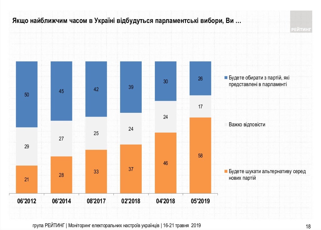 На цьогорічних президентських виборах хвиля усвідомлення необхідности рішучої зміни політичних еліт дійшла вже до більшої частини вітчизняного електорату. 58% виборців заявили соціологам, що збираються голосувати за партії, котрі ще не були в політиці. Як наслідок – перемога на виборах президента Володимира Зеленського й лідирування в рейтингах його політсили зі значним відривом, і це попри те, що зовсім недавно її, по суті, ще й не існувало.