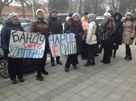 Люди тримають плакати "Мойсеєнко – позор для УДАРу"(Віталій Мойсеєнко директор КП "Дрогобицький ринок"), "Банду геть з Дрогобича". Крім цього, пікетувальники заявляють, що в Дрогобичі хочуть забудувати старе єврейське кладовище.