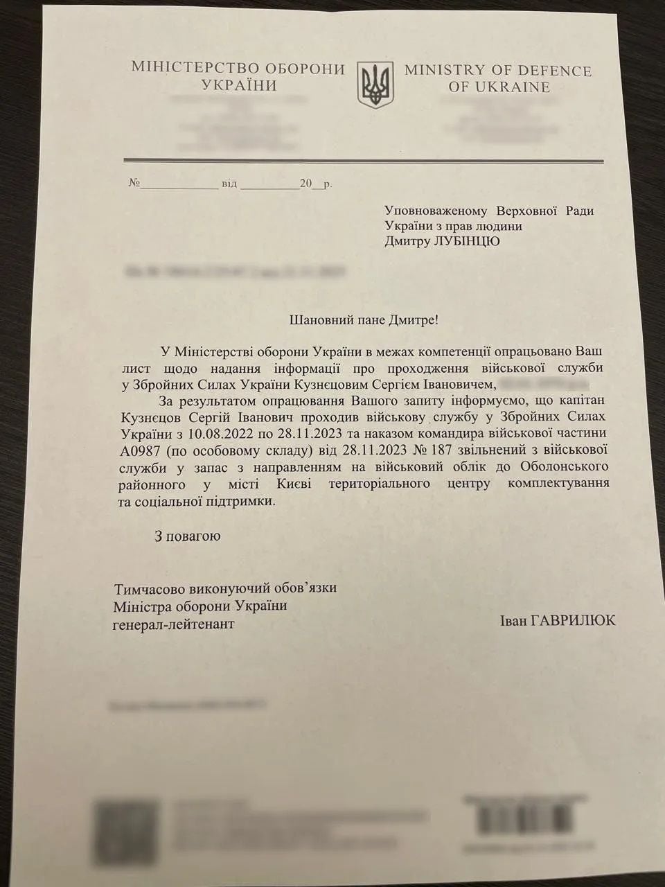 У відповіді Міністерства оборони України на запит омбудсмана Дмитра Лубінця йдеться, що Кузнєцов проходив службу у військовій частині А0987 з 10 серпня 2022 року до 28 листопада 2023 року у званні капітана. Відповідно до відкритих даних, ця частина входить до структури Командування ССО, дислокованого у Києві.