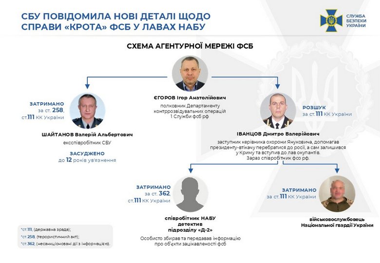 «Згодом СБУ встановила, що іще один агент Єгорова-Іванцова - колишній співробітник МВС, який на час затримання виявився діючим співробітником НАБУ (ред. – йдеться про Віталія Гусарова). За матеріалами справи, цей посадовець Бюро був завербований ворогом ще у 2012 році», – повідомили у пресслужбі СБУ.