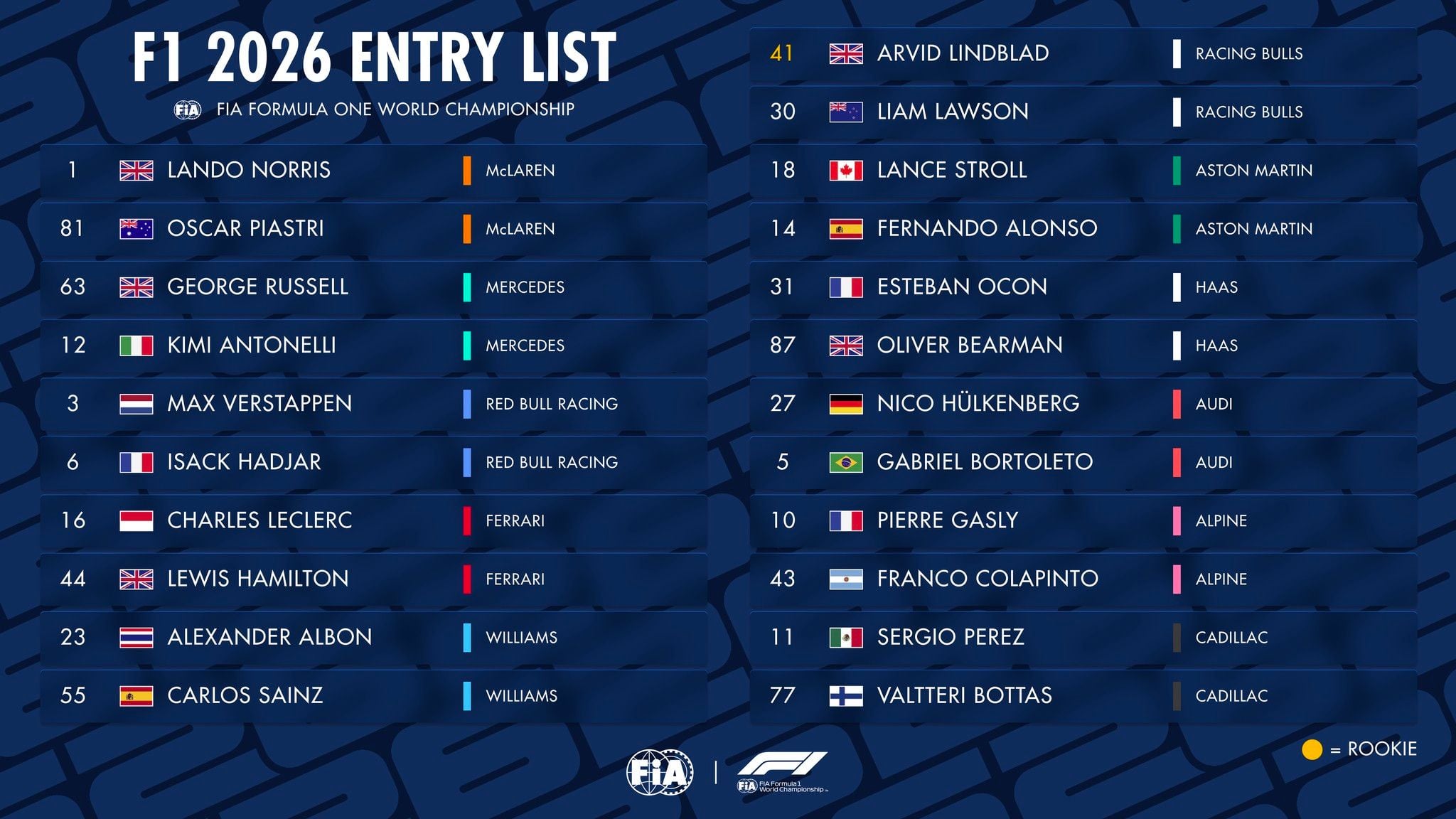 Також варто звернути увагу на новачка Арвід Ліндблад «ганятиме» під № 41. Решта пілотів залишилися зі звичними номерами, зокрема і свіжоспечені гонщики Cadillac – Серхіо Перес (№ 11) і Валттері Боттас (№ 77).