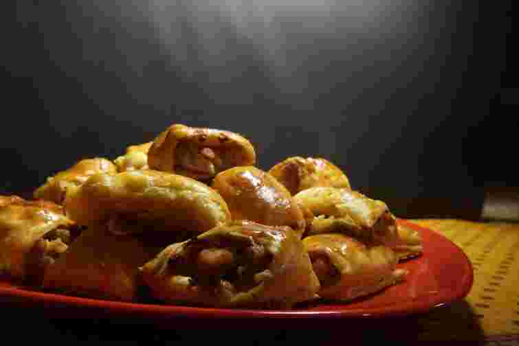 Посипати стіл борошном. Взяти пачку тіста (воно має бути розмороженим). Розкачати у великий прямокутник. Поділити на дві частини. Викласти начинку на краєчок тіста. Скрутити його у рулет. Виходить два рулети з різними начинками. Краї тіста добре склеїти. Нарізати на порції. Можна навіть не зщипувати краї.