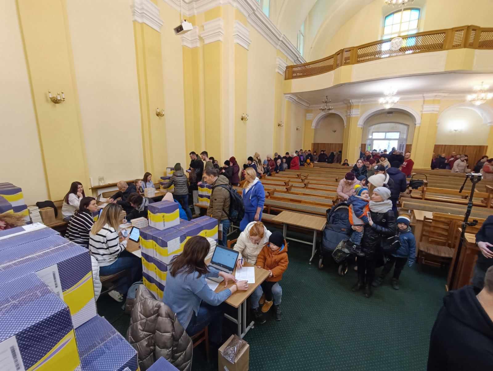 З літа 2022 року наша церква перейшла до системної співпраці з переселенцями, які оселилися у Львові та Львівській області. Ми започаткували регулярну роздачу продуктових наборів, збільшивши їх кількість з 200 до 1300 щомісяця. За період війни роздали понад 24 тис. продуктових наборів. Неможливо було спокійно дивитися на черги, які стояли за продуктовими наборами у перші місяці війни. Паралельно ми виставляли гуманітарну допомогу, і переселенці собі підбирали речі.