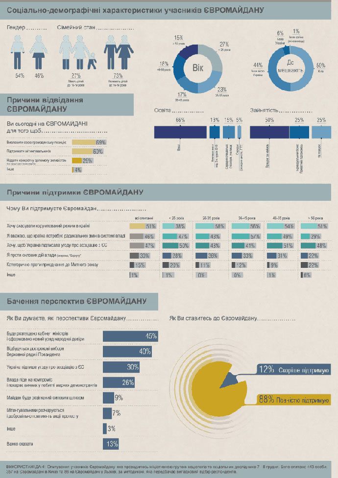 Такі дані опитування, яке проводилось ініціативною групою соціологів та соціальних дослідників. На запитання про причини відвідання Євромайдану, 69% сказали, що так висловлюють свою громадянську позицію,60%,що прийшли підтримати мітингувальників, 29% - прийшли надати конкретну допомогу активістам.