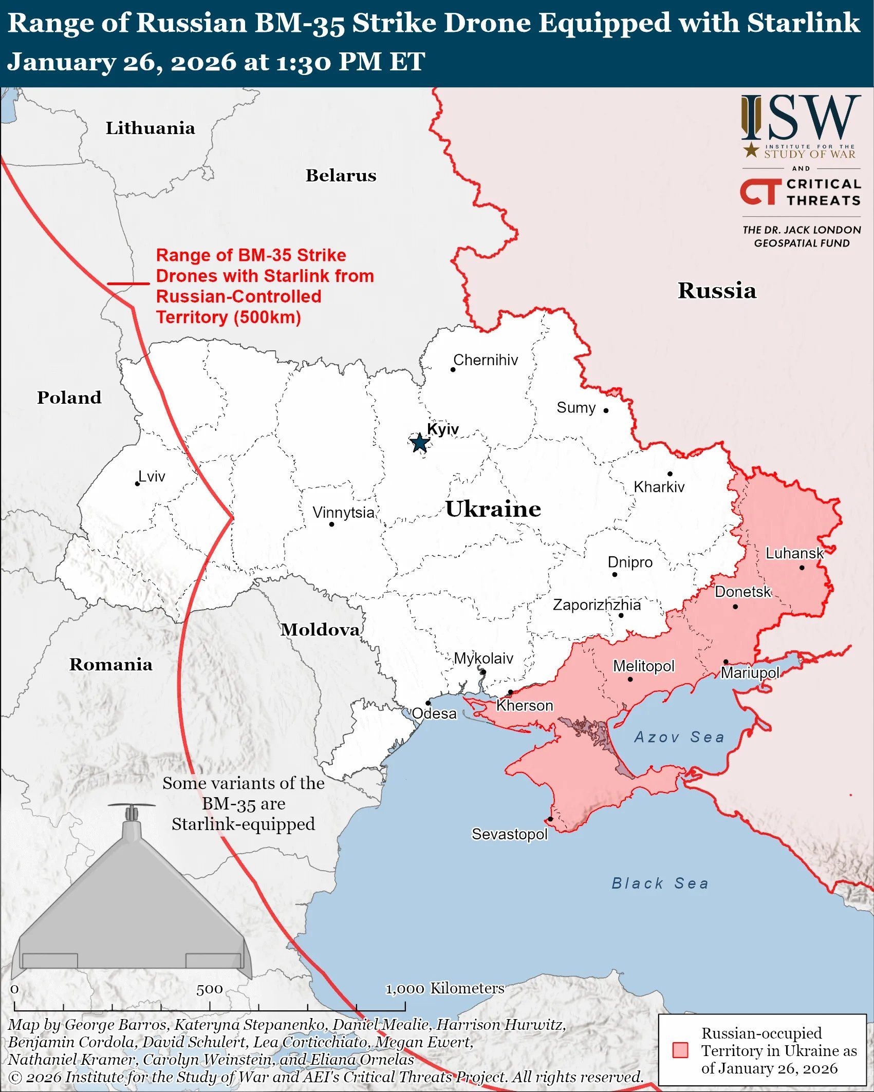 За даними ISW, дільність російських дронів БМ-35, оснащених Starlink, становить 500 км. Це означає, що зона ураження охоплює більшу частину України, всю Молдову та частини Польщі, Румунії та Литви. В інституті повідомили, що фіксують використання Starlink на російських дронах Shahed з вересня 2024 року та БпЛА «Молнія» з грудня 2025 року.