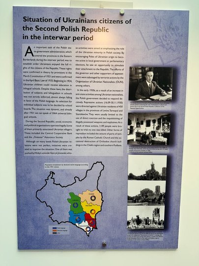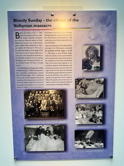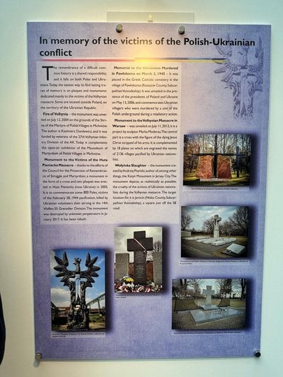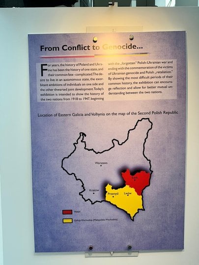 На стендах пише, що виставка висвітлює історію двох народів з 1918 до 1947 року, показуючи найскладніші періоди. Причому дії українців автори виставки називають геноцидом, а поляків – «відплатою» у лапках, зазначають, що українці після завершення Першої світової війни «претендували на територію східної Галичини», хоча «громадяни українського походження становили 15% від всього населення».