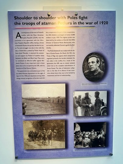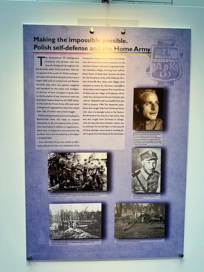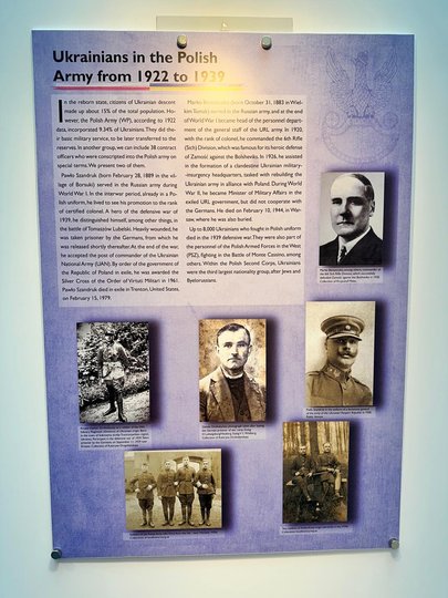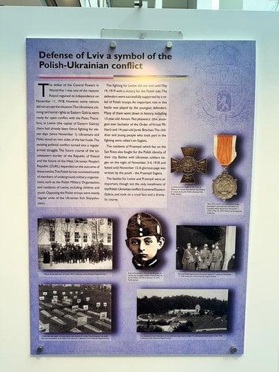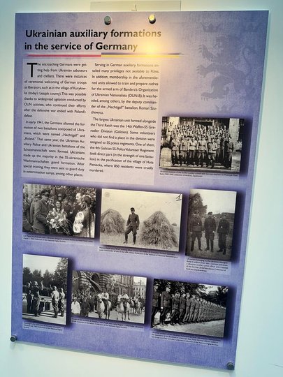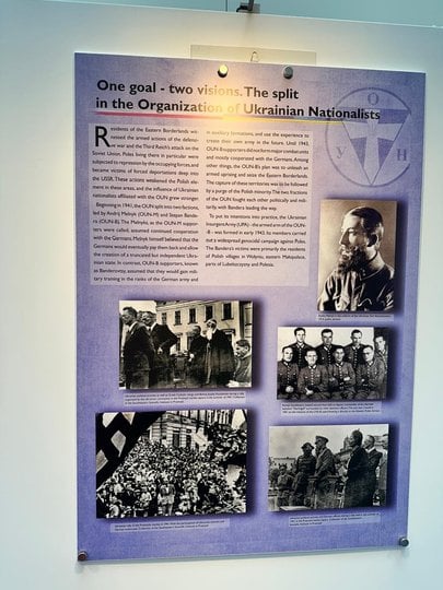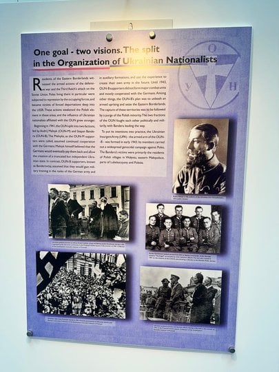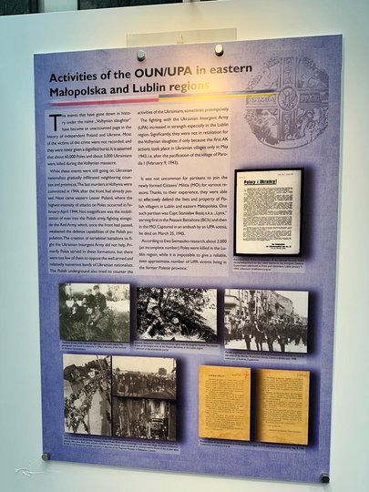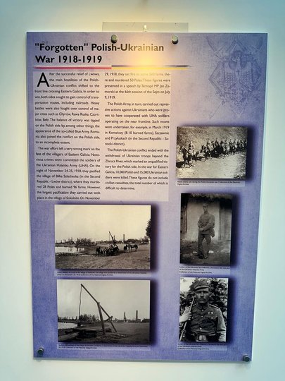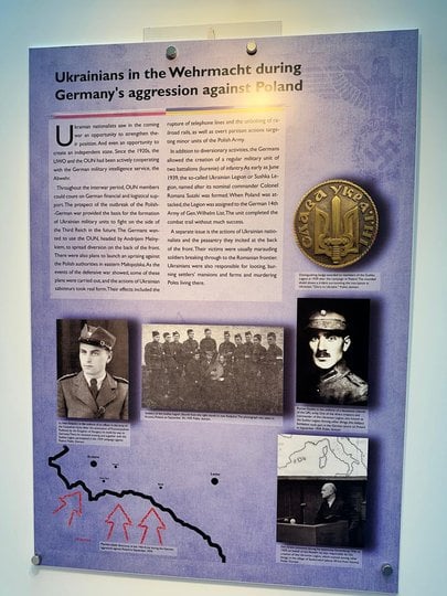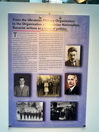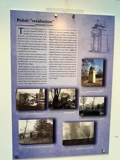 Інформація на стендах звинувачує бійців Української Галицької Армії (УГА) та діячів ОУН -УПА у численних злочинах.