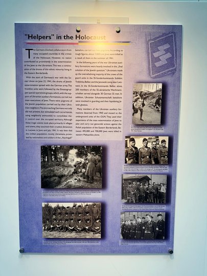 «Німці залучали колаборантів з багатьох окупованих країн до злочинів Голокосту. Однак жодна нація не зробила такого помітного внеску у знищення євреїв, як українці», – пише на банерах. Також там зазначено, що українці брали участь у єврейських погромах і вбивстві 7000 львівських євреїв у 1941 році, а «досвід вбивств євреїв застосували потім у винищенні польського населення».