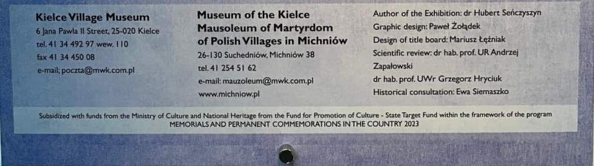На стенді зазначено, що виставку організував Музей села у Кєльце і Мавзолей мучеництва польських сіл у Міхньові. Її автором є доктор Губерт Сеньчишин. Профінансувало виставку Міністерство культури і спадщини з фонду промоції культури.