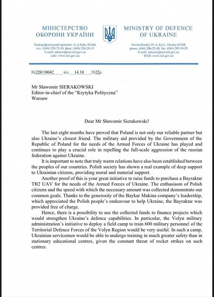 Нагадаємо, влітку 2022 року громадський діяч і журналіст Славомир Сєраковський ініціював акцію «Купімо Україні Bayraktar» на краудфандинговій платформі Zrzutka.pl. Понад 200 тис. людей зібрали 22,5 млн злотих (близько 5 млн доларів) на Bayraktar для України. Однак турецька компанія Baykar, що виготовляє ці безпілотні літальні апарати, заявила, що передасть Україні ударний безпілотник Bayraktar TB2 безкоштовно.