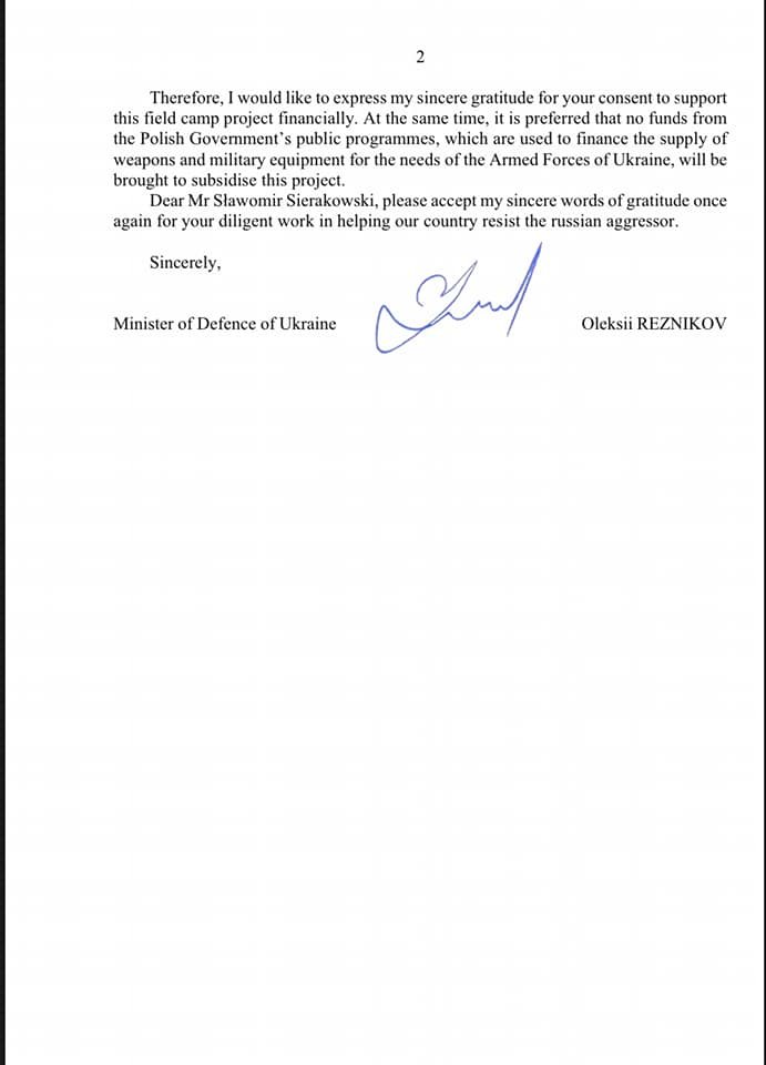 Як зазначено у листі Олексія Резнікова, польовий табір розташують на Волині для підготовки бійців територіальної оборони.