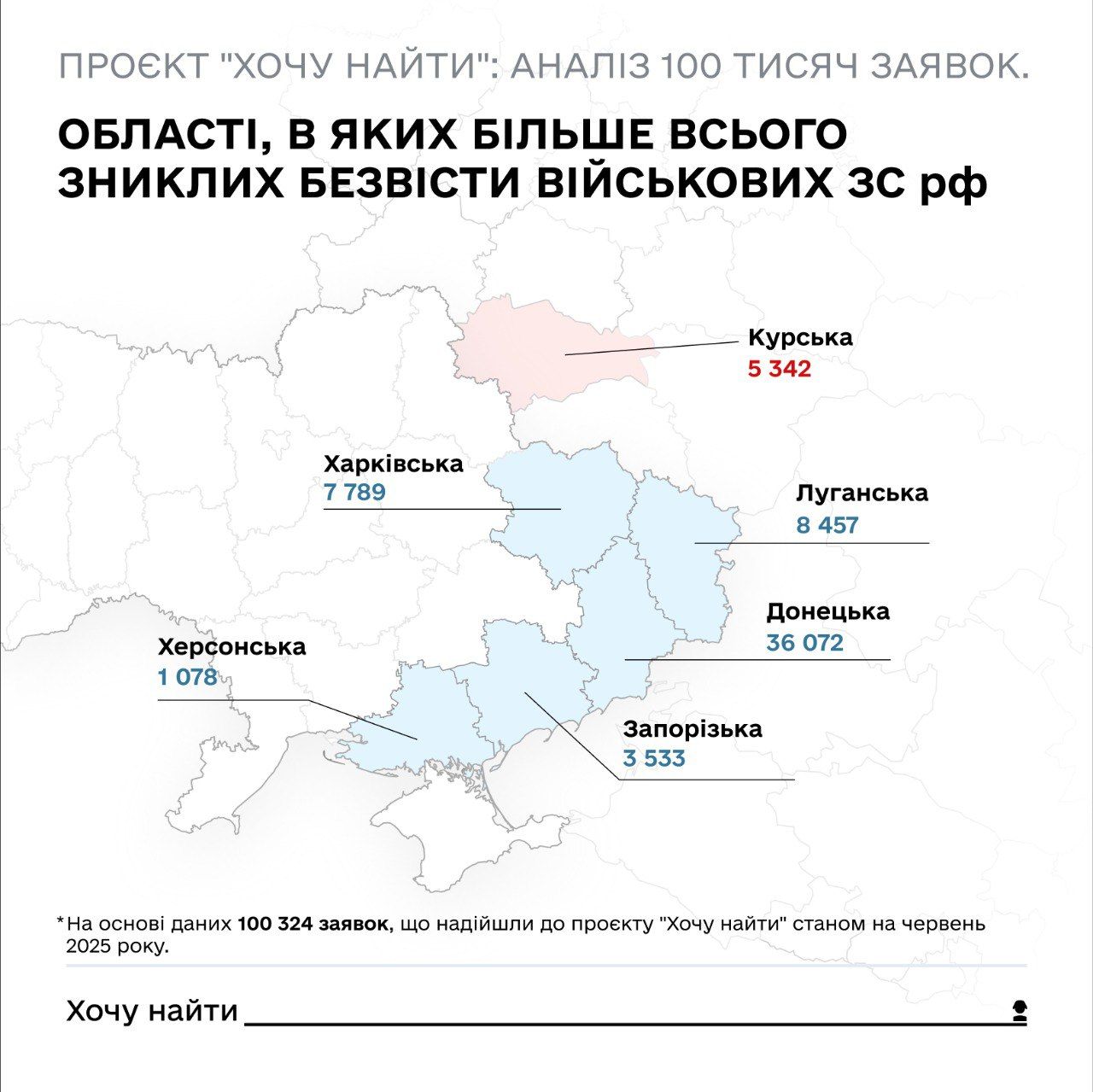 Серед районів бойових дій, де зафіксовано найбільшу кількість зниклих безвісти окупантів, перше місце посідає Покровський район Донецької області – 16 тис. 510 заявок.