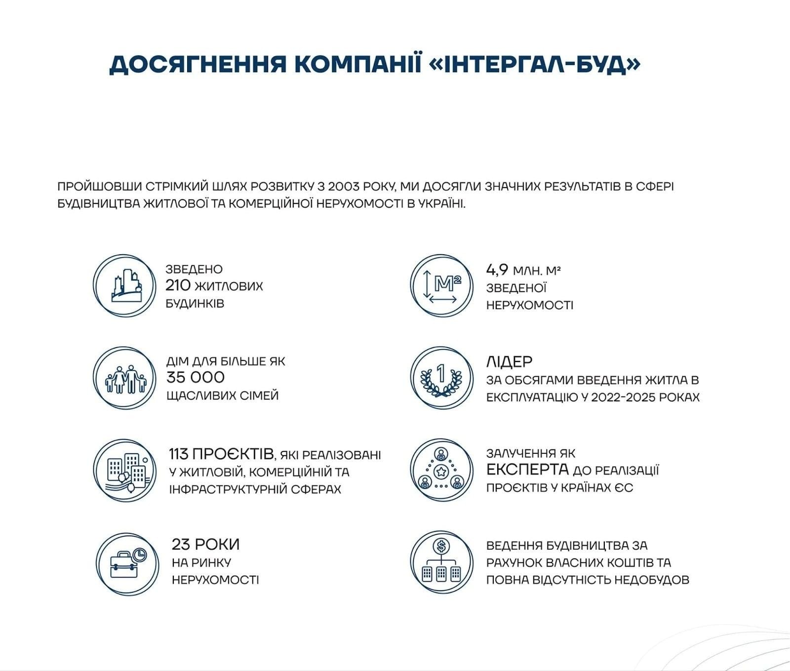 За 23 роки історії в портфелі компанії «Інтергал-Буд» – понад 113 реалізованих житлових і комерційних проєктів у різних містах України. Ключі від власних осель отримали понад 35 тисяч сімей. Всі об'єкти вводяться в експлуатацію вчасно та з максимальною зручністю для клієнтів.