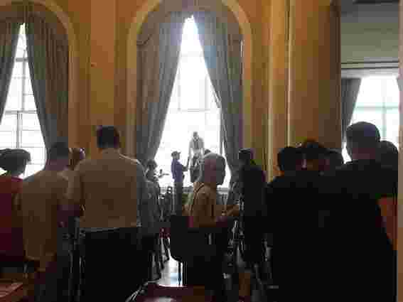 Варто зауважити, що сесійна зала міськради розташована на другому поверсі львівської Ратуші, на висоті приблизно восьми метрів.