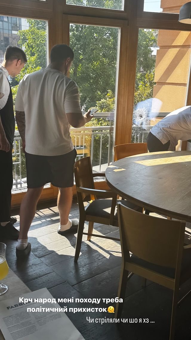 «Тут потужний звук, ми падаємо на підлогу і сиділи так 5 хвилин. Може бути, що збивали шахед у цей момент. Подія, звичайно, не стандартна. Приїхала поліція, дав свідчення», – написав Дмитро Варварук в Instagram. Дмитро Варварук оприлюднив фото, на якому видно отвір від влучання.