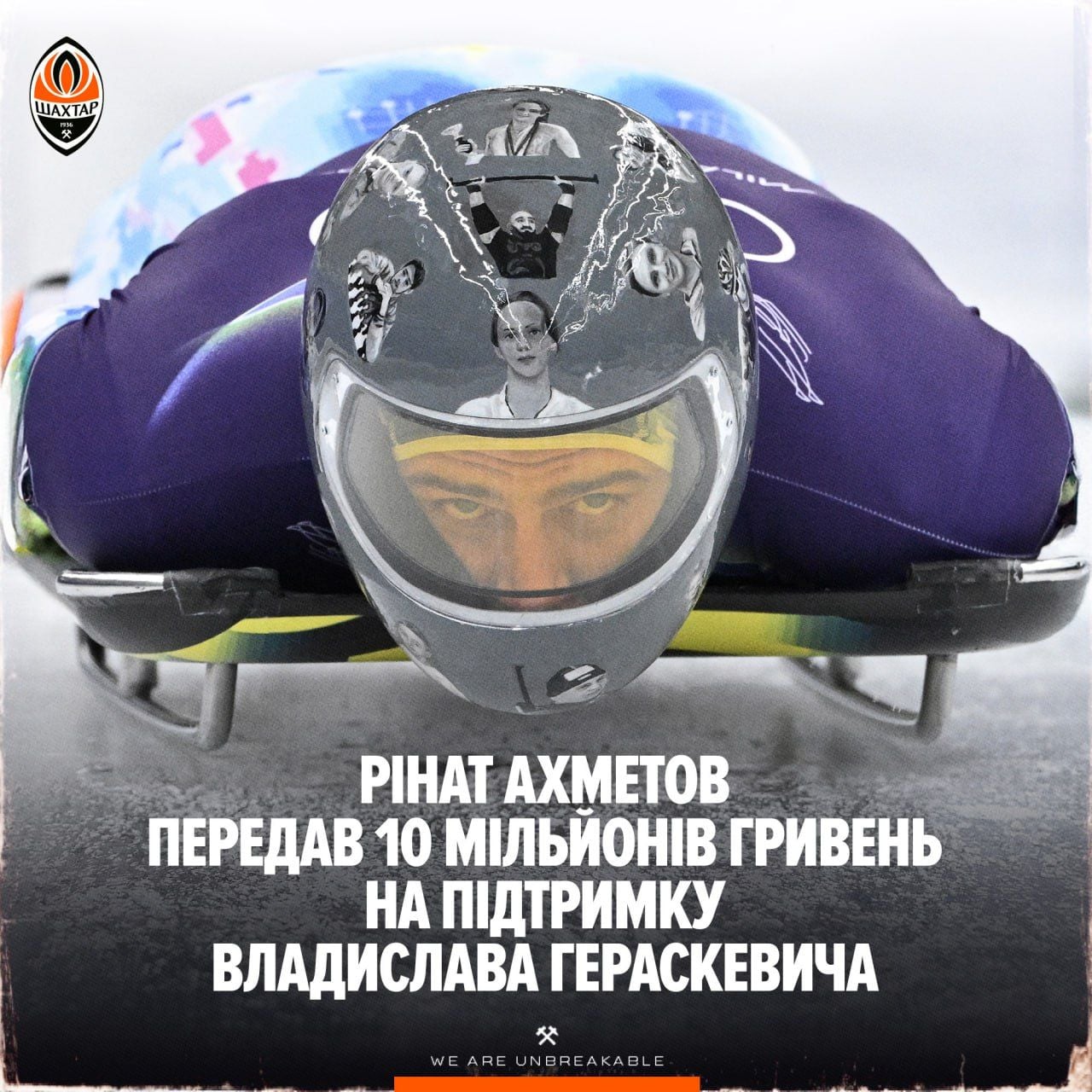Президент «Шахтаря» Рінат Ахметов вирішив долучитися до фінансової підтримки українського скелетоніста Владислава Гераскевича після його дискваліфікації на Олімпійських іграх через «шолом пам'яті».