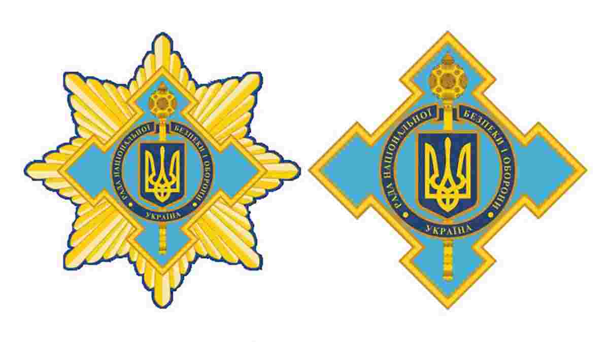 Знаком РНБО України є восьмипроменева зірка з променями, що розходяться, на якій розміщена емблема Ради.