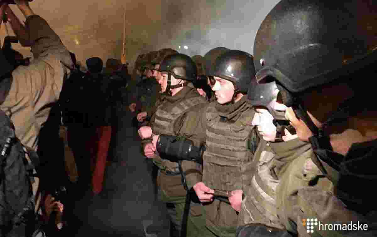 Перед будівлею вишикувався кордон правоохоронців у захисному спорядженні. Мітингувальники почали через голови поліцейських кидати каміння в будівлю і побили вікна в офісі. Також були застосовані петарди і димові шашки.