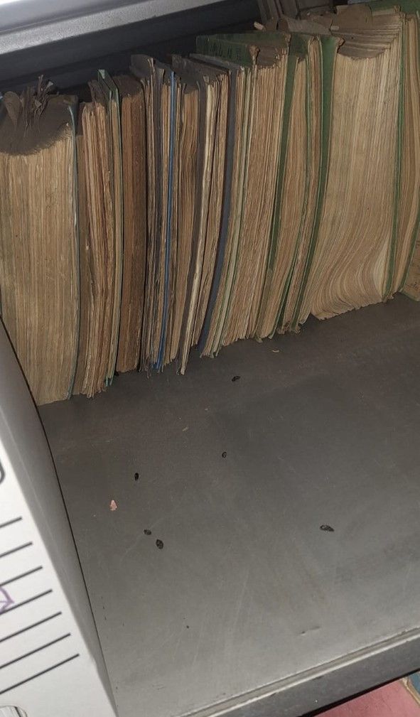 Поруч із тим, на полицях та на підлозі документи лежали насипом. Така ж ситуація із фотофіксацією пам’яток – приклеєна на твердий картон без підпису пам’ятки, її автора та дати.