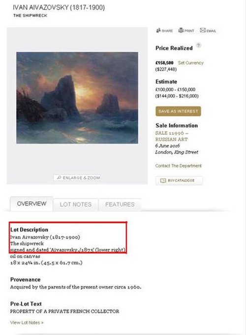 «Разом з тим звертаємо увагу, що за інформацією, розміщеною на офіційному сайті аукціонного дому Christie's, картина І.Айвазовського з назвою «Корабельна аварія», датована 1875 роком, прийнята до продажу у власника, який надав підтвердження права власності на зазначену картину, як таку, що перебувала у власності його родини з 1960 року у приватній колекції, що перебувала на території Франції», - заявляє Мінкульт.