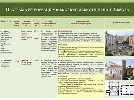 У Програмі регенерації колишньої міської юдейської дільниці йдеться про вулиці Федорова, Арсенальську, Староєврейську та Братів Рогатинців. Сама Програма 12 квітня цього року була схвалена Науково-методичною радою з питань охорони культурної спадщини Міністерства культури України. Директор Представництва американського об’єднання комітетів для євреїв колишнього Радянського Союзу Мейлах Шейхет розповів, що програма зараз перебуває на погодженні ЮНЕСКО в Парижі. Програму розробляли на його замовлення за грантові кошти посольства США.