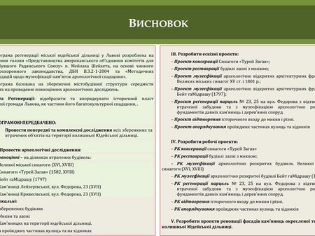 Проект відновлення історичної єврейської дільниці м. Львова передбачає повні та локальні археологічні дослідження, музеєфікацію знайдених об’єктів, реновацію, консервацію та реставрацію будівель, що входили до міської юдейської дільниці. Про це сьогодні, 22 травня, розповіла під час презентації старший науковий співробітник ДП «Укрзахідпроектреставрація» Оксана Бойко.