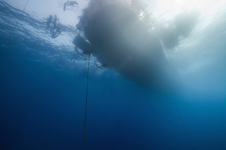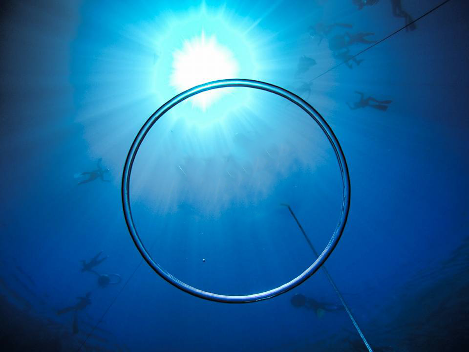 занурюється в блакитну діру Діна на Багамських островах, але не повністю, а до певного рівня (максимальна її глибина – 202 метри). Спочатку подумалось, що це комп'ютерна графіка чи монтаж, але згодом виявилось: ніякої підстави на ролику немає.