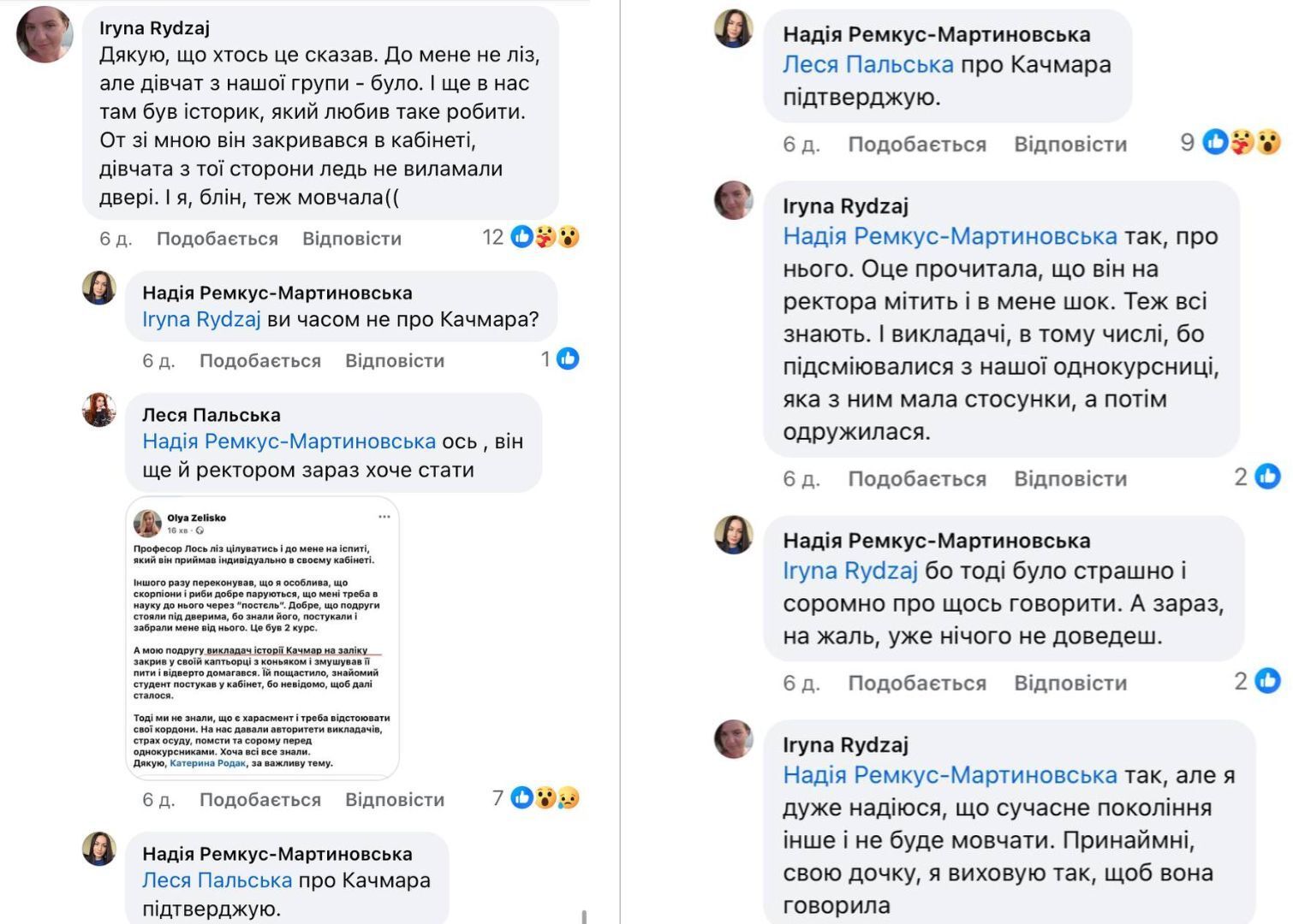 «Ще в нас там був історик, який любив таке робити. От зі мною він закривався в кабінеті, дівчата з тої сторони ледь не виламали двері. І я, блін, теж мовчала, – згодом Ірина Ридзай підтвердила, що йдеться саме про Володимира Качмара, – У мене шок, що він хоче бути ректором. Всі знають. І викладачі, зокрема, бо сміялися з нашої однокурсниці, яка з ним мала стосунки, а потім одружилася».