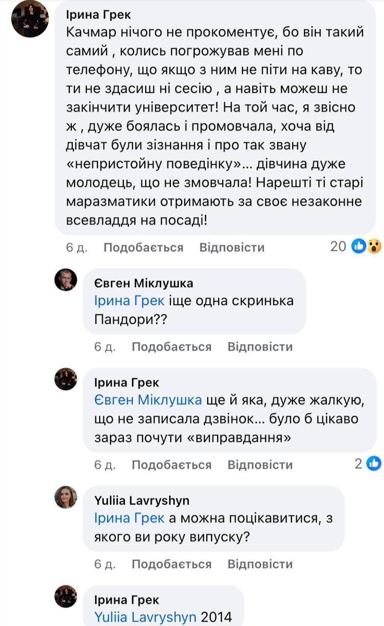 У коментарях до публікації журналістка та колишня студентка факультету журналістики Олена Івашків написала про домагання, які сталися 2003 року. Тоді Олена була студенткою першого курсу факультету журналістики.