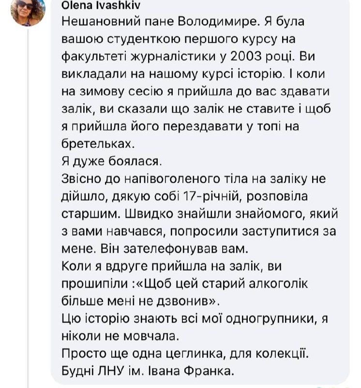 «Нешановний пане Володимире. Ви викладали на нашому курсі історію. І коли на зимову сесію я прийшла до вас здавати залік, ви сказали що залік не ставите і щоб я прийшла його перездавати у топі на бретельках. Я дуже боялася. Звісно, до напівоголеного тіла на заліку не дійшло. Дякую собі 17-річній, розповіла старшим. Швидко знайшли знайомого, який з вами навчався, попросили заступитися за мене. Він зателефонував вам. Коли я вдруге прийшла на залік, ви прошипіли: "Щоб цей старий алкоголік більше мені не дзвонив"», – написала Олена Івашків.