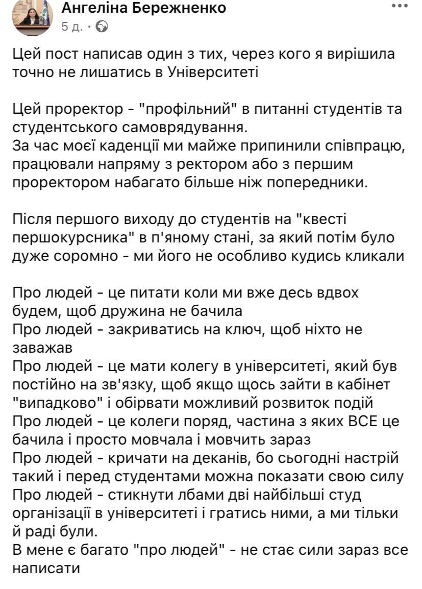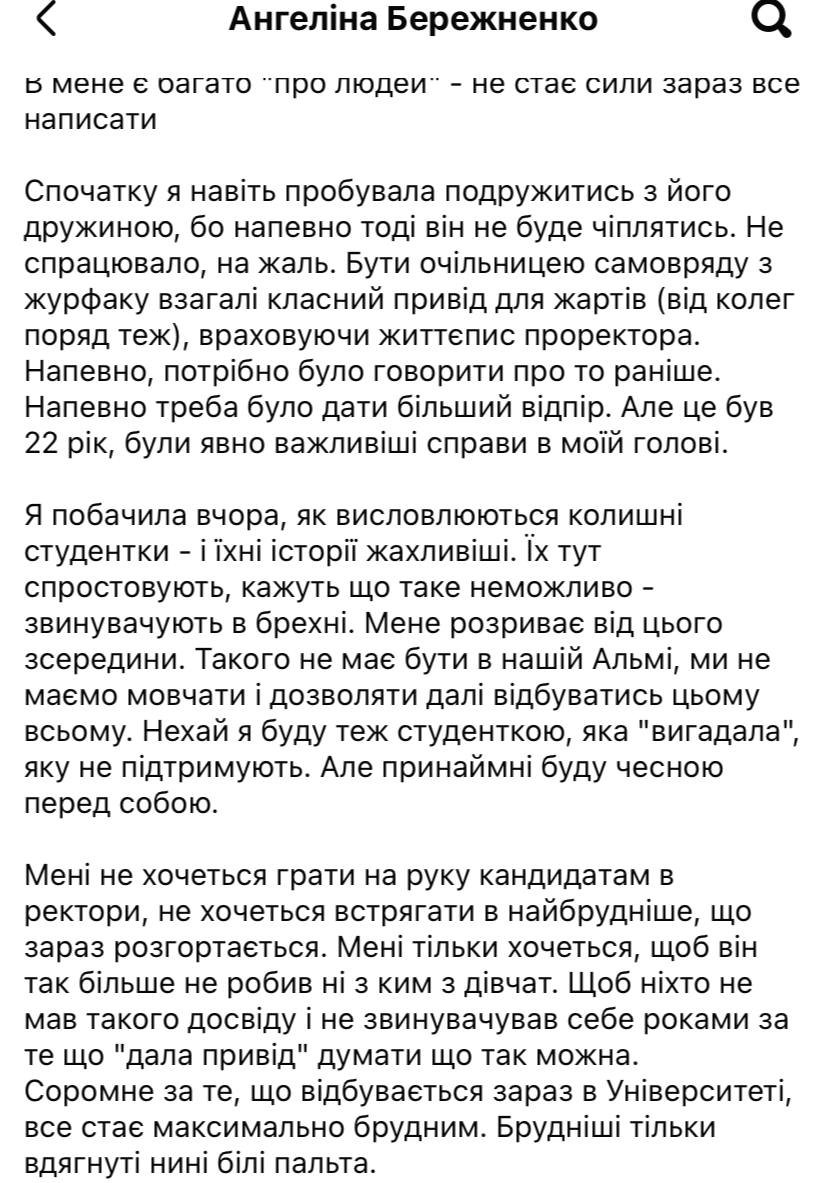 «Про людей – це питати коли ми вже десь вдвох будем, щоб дружина не бачила. Про людей – закриватись на ключ, щоб ніхто не заважав. Про людей – це мати колегу в університеті, який був постійно на зв'язку, щоб якщо щось зайти в кабінет "випадково" і обірвати можливий розвиток подій. Про людей – це колеги поряд, частина з яких все це бачила і просто мовчала і мовчить зараз. Про людей – кричати на деканів, бо сьогодні настрій такий і перед студентами можна показати свою силу», – написала Ангеліна Бережненко.