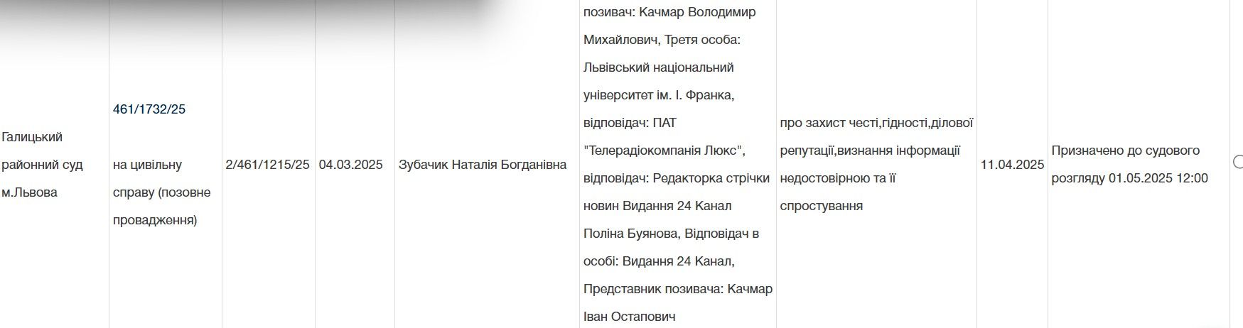Справу розглядатиме Галицький райсуд Львова. Відповідачами є ПАТ «Телерадіокомпанія Люкс» та редакторка стрічки новин 24 каналу Поліна Буянова. Володимир Качмар вимагає спростування інформації. Наступне засідання у справі призначили на 1 травня 2025 року.